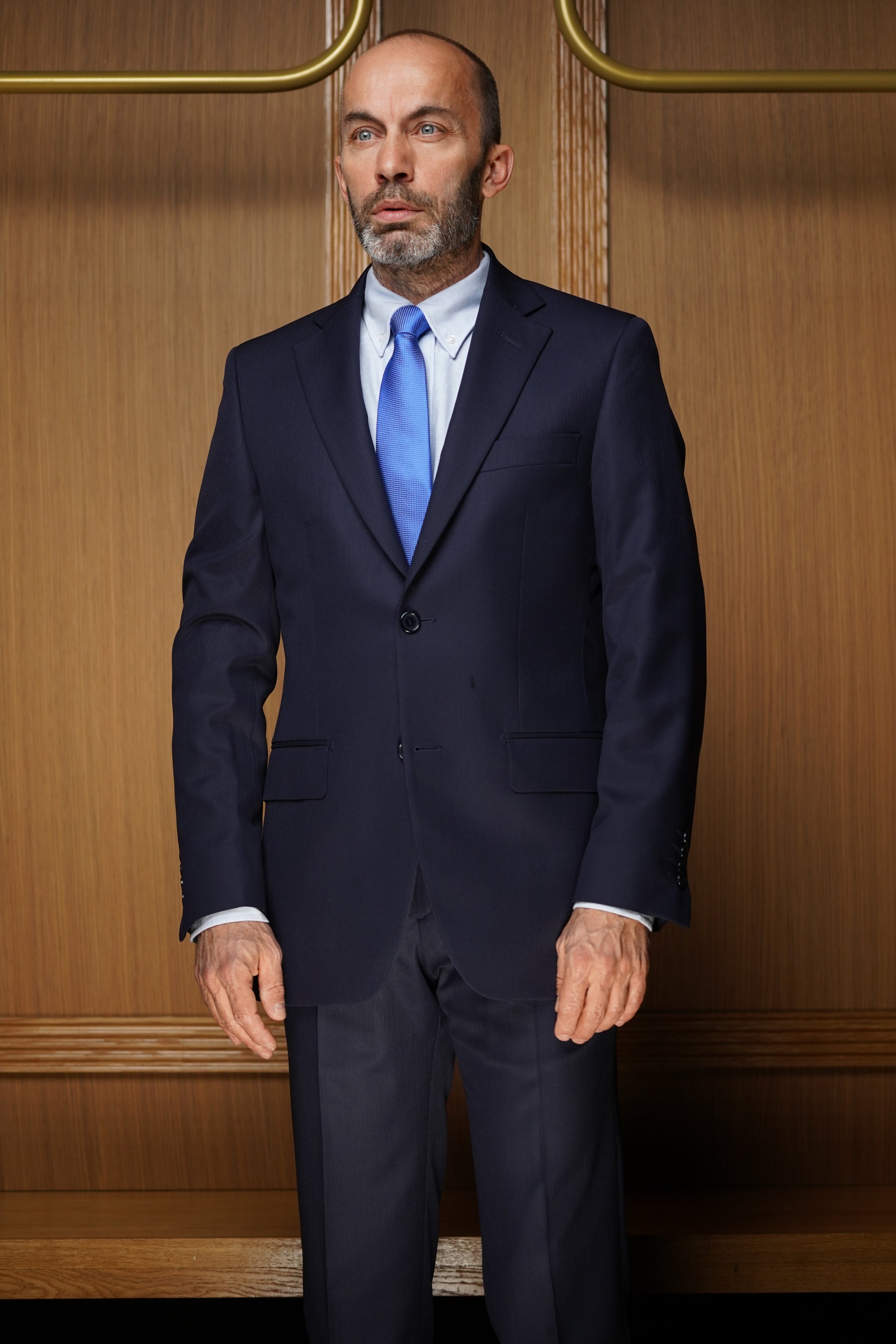 Ce costume Coriolan se distingue par son tissu en pure laine signé Vitale Barberis Canonico, d’un bleu profond animé de rayures fondues pour une élégance subtile et moderne.