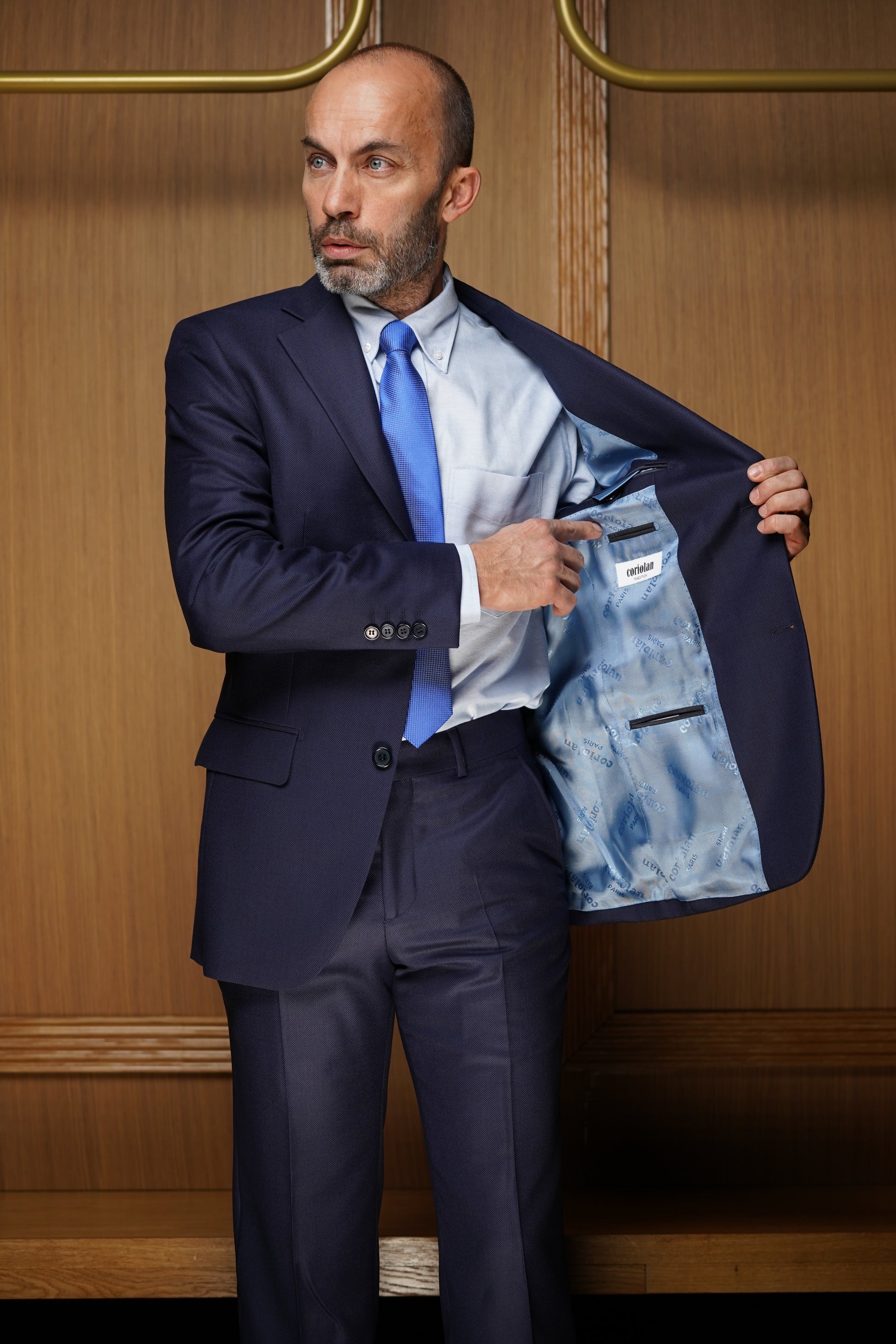 Sobre et raffiné, ce costume Tradition est réalisé dans un tissu caviar en pure laine, dont la texture subtile apporte du relief et de la profondeur à son bleu élégant.
