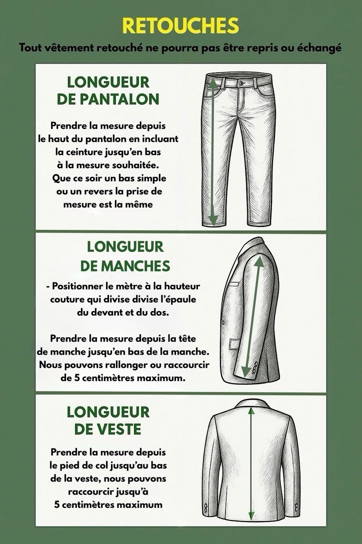 Pour les retouches, merci de nous envoyer vos mesures par email à coriolanformen@gmail.com