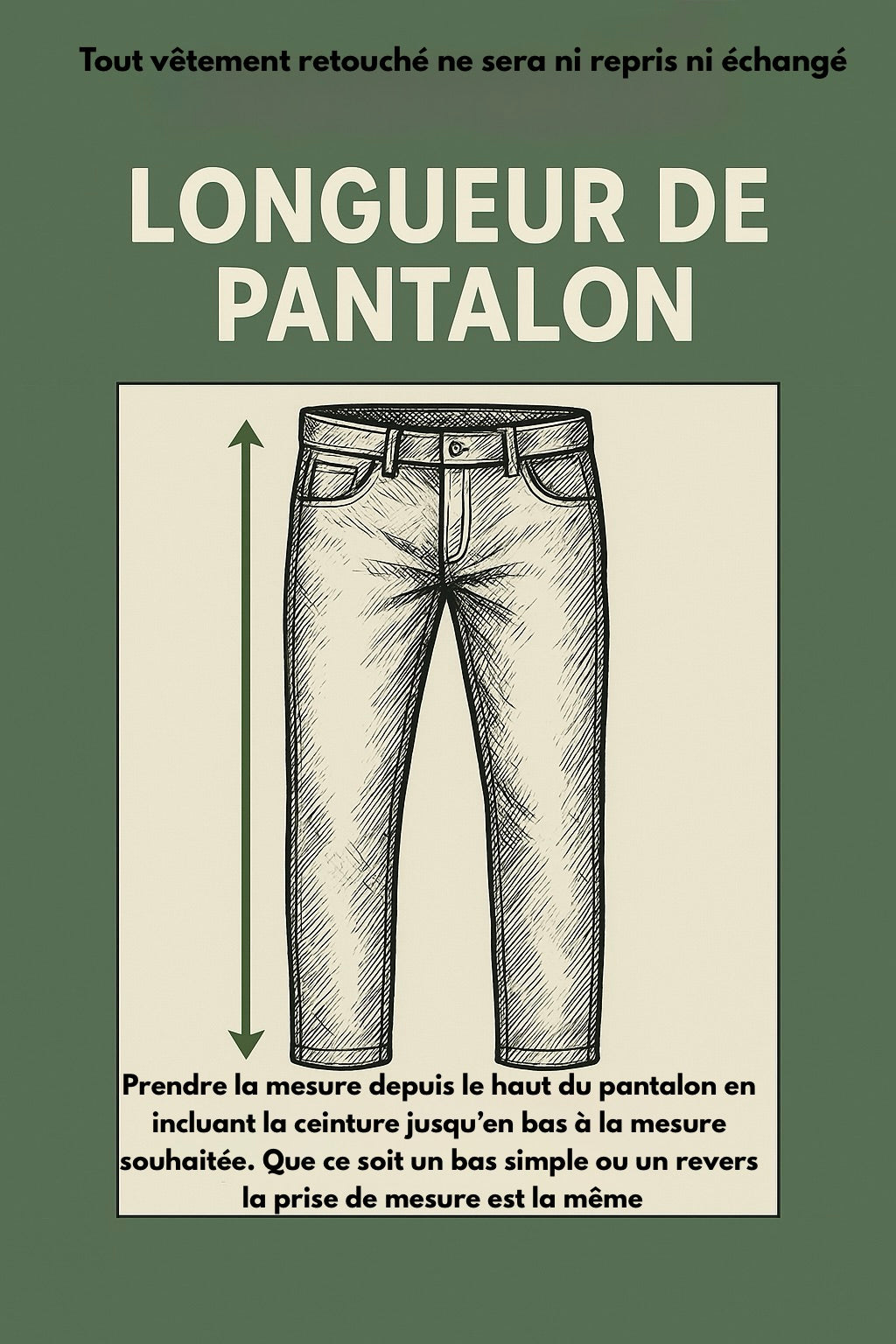 Prendre la mesure depuis, le haut du pantalon en incluant la ceinture jusqu’en bas à la mesure souhaitée. Que ce soir un bas simple ou un revers la prise de mesure est la même.